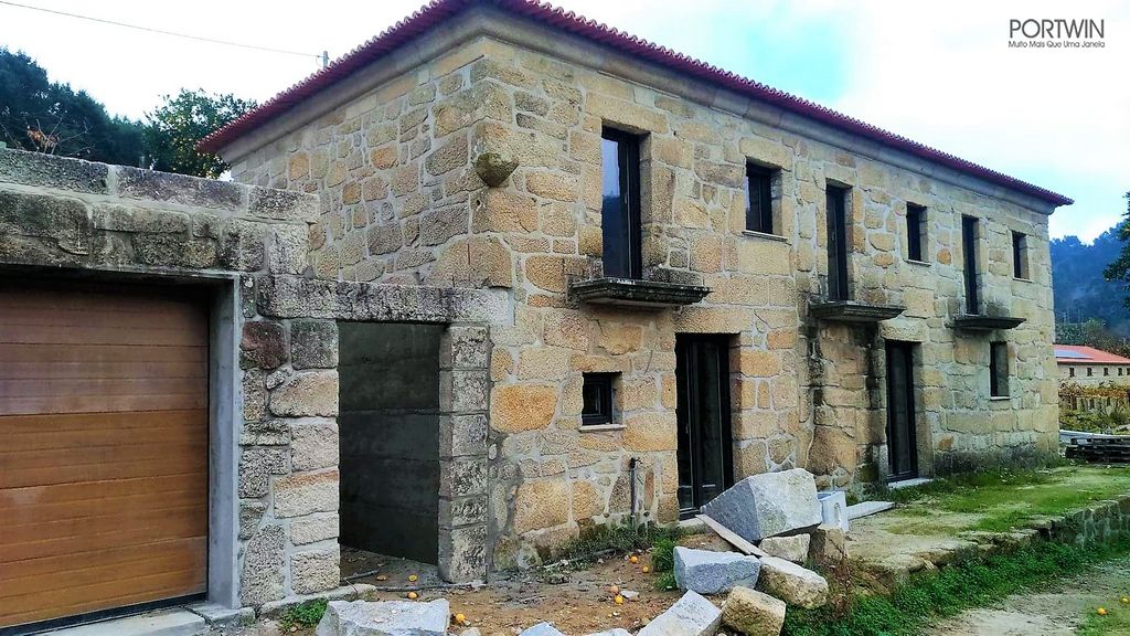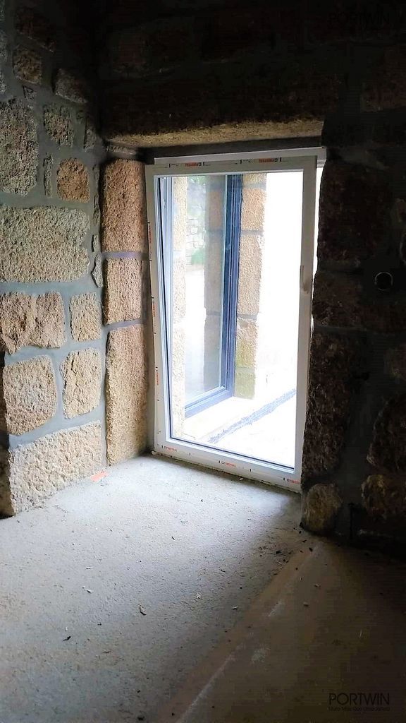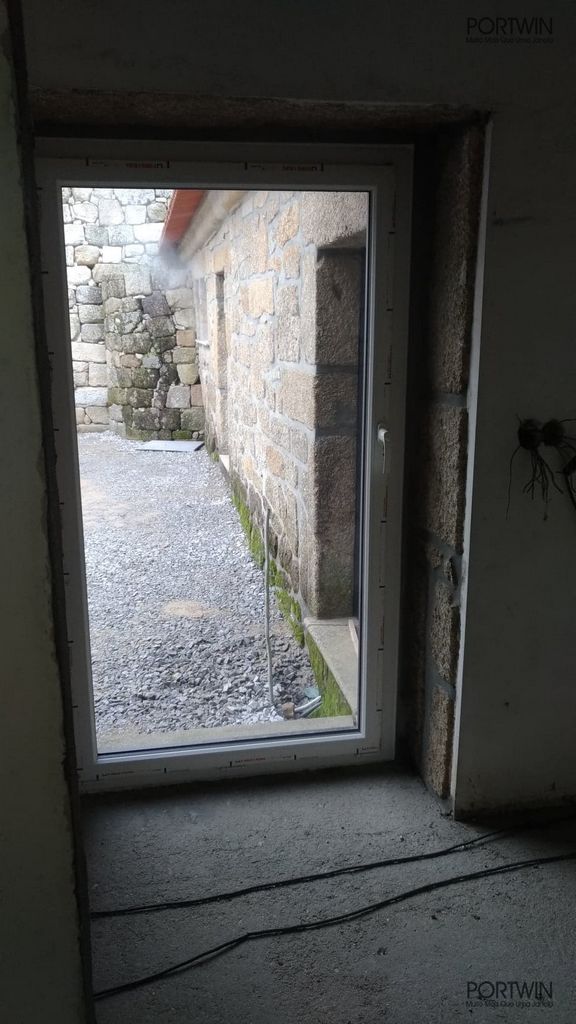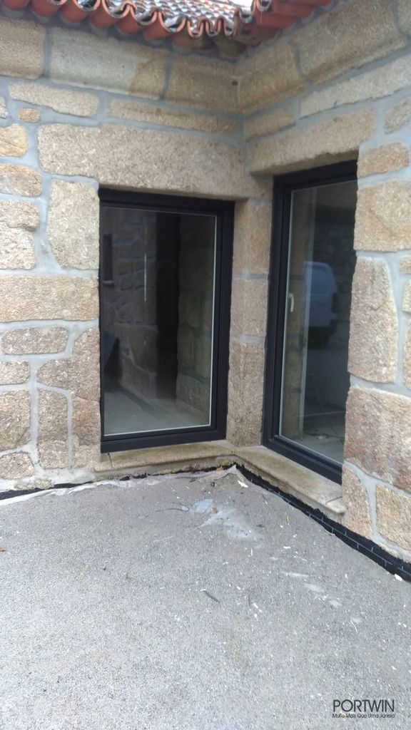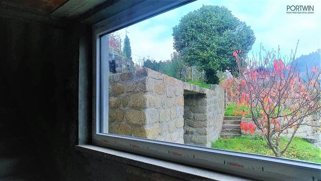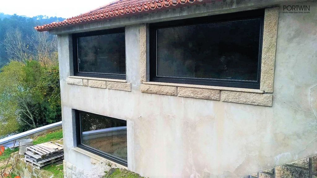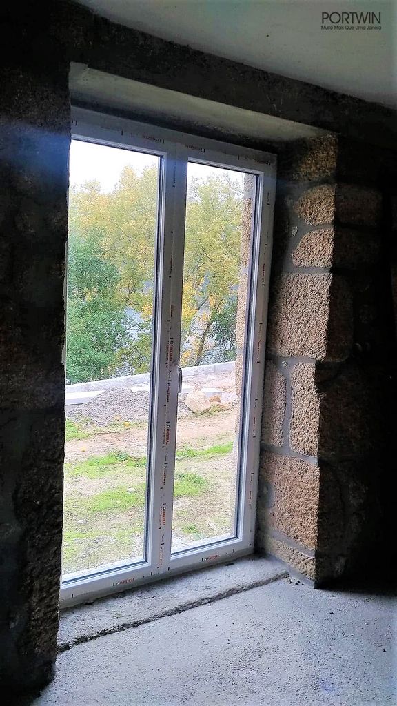 Montagem FINSTRAL, FIN 72 capeado a Alumínio pelo exterior (cor sablé) e PVC no interior (cor branco gravado). Folha Slim Line, vidro duplo baixo emissivo e laminado 30mm. Ferragem Verão/Inverno, que permite otimizar a ventilação do espaço.