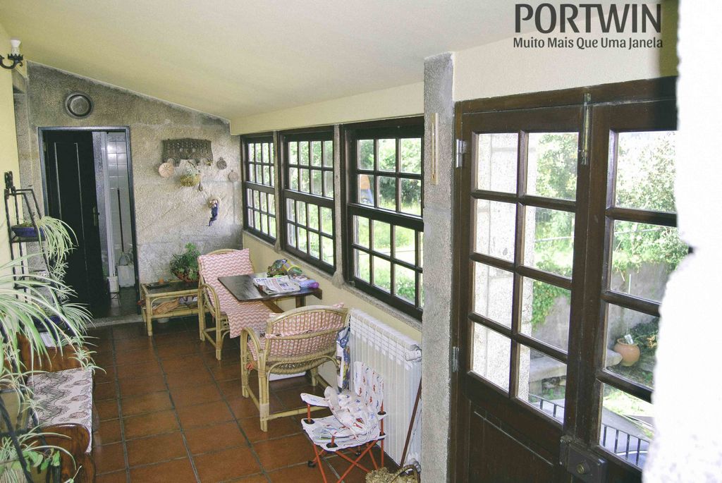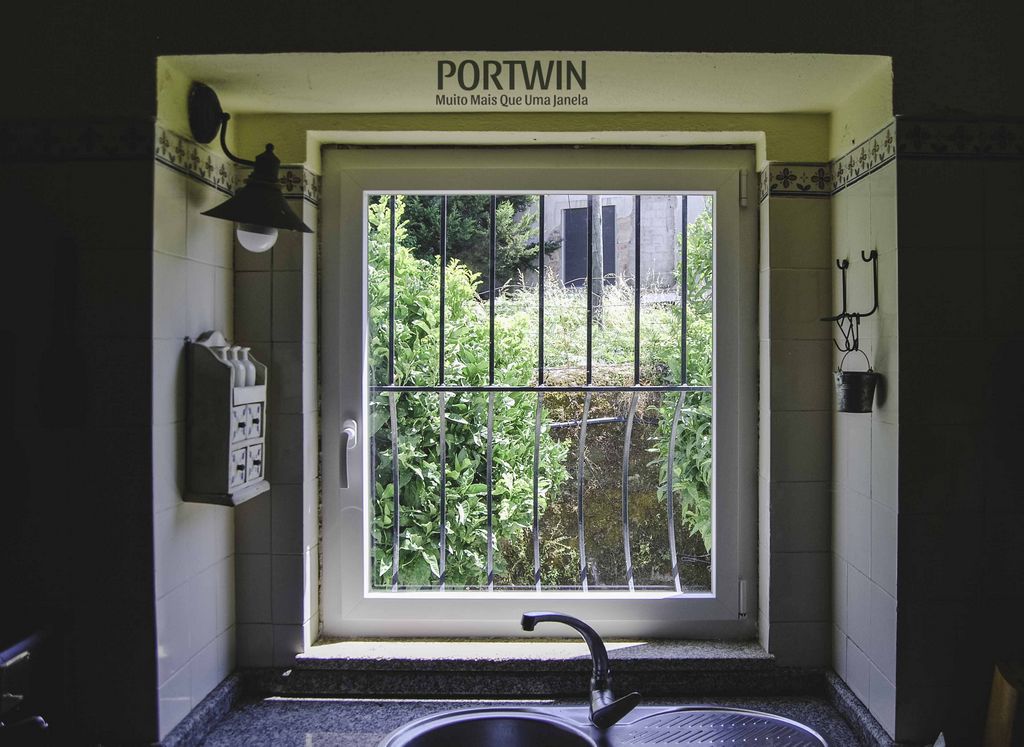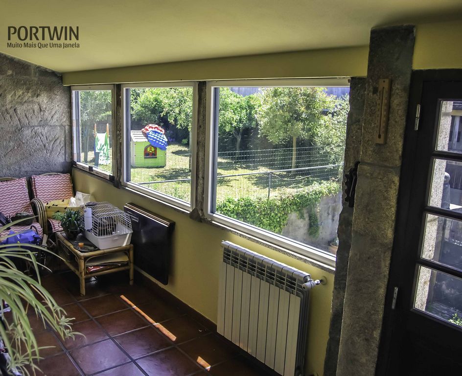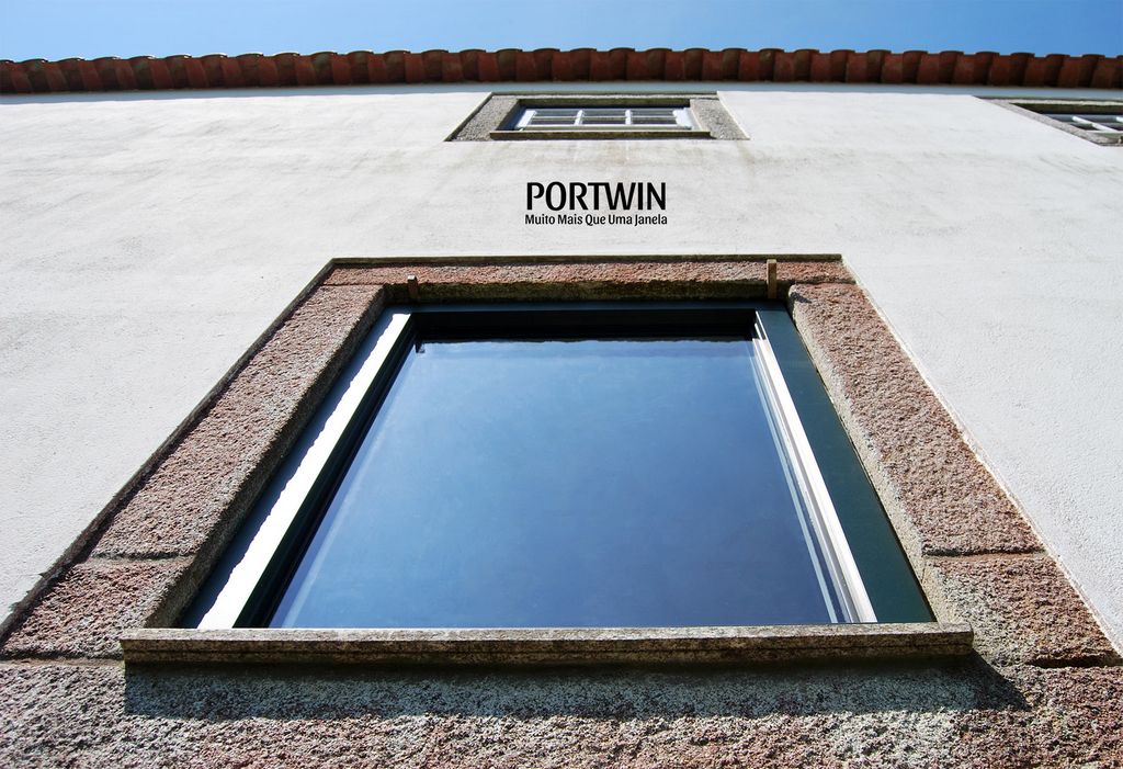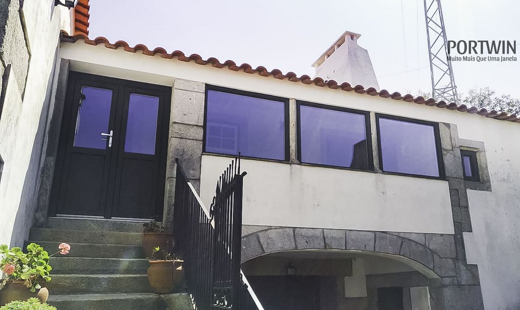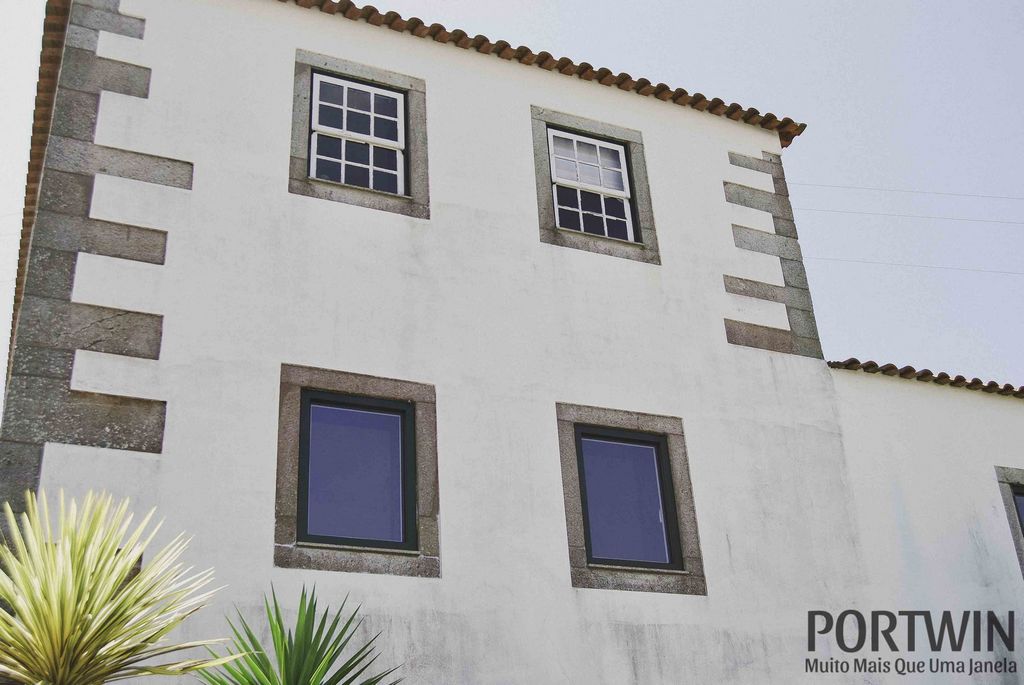 Montagem FINSTRAL, série FIN 72 com folha NOVA LINE KAB. Na cor branco satinado pelo interior e pelo exterior com revestimento em Alumínio na cor verde (efeito especial).