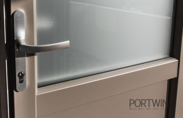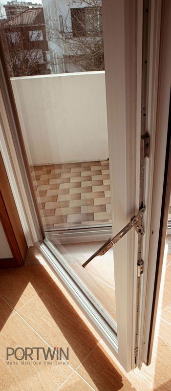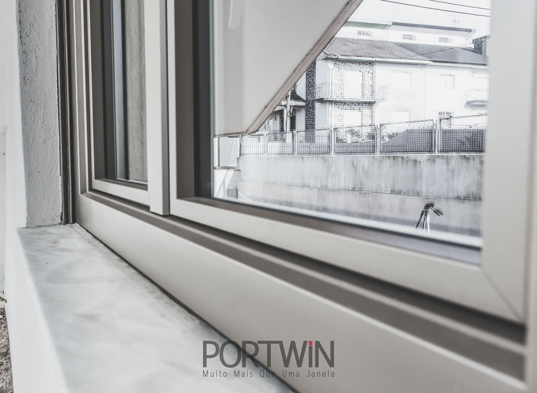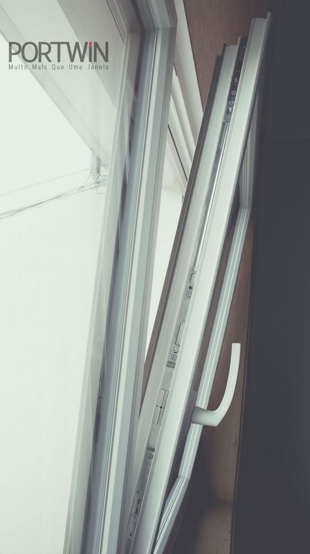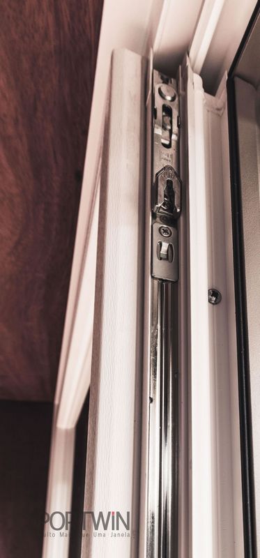 Série FIN-72, Slim Line KAB. Pelo exterior com revestimento em alumínio e pelo interior em PVC na cor branco texturado (gravado diretamente no perfil, sem recurso a película adesiva). Vidro Duplo baixo emissivo e de controlo solar Mediterran 2 30 mm e separador intercalar com isolamento térmico. Ferragem de segurança e ferragem de ventilação Verão/Inverno,permitindo reduzir a posição basculante.