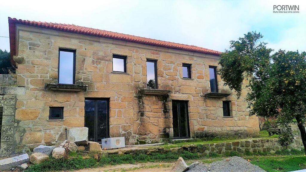 Montagem FINSTRAL, FIN 72 capeado a Alumínio pelo exterior (cor sablé) e PVC no interior (cor branco gravado). Folha Slim Line, vidro duplo baixo emissivo e laminado 30mm. Ferragem Verão/Inverno, que permite otimizar a ventilação do espaço.